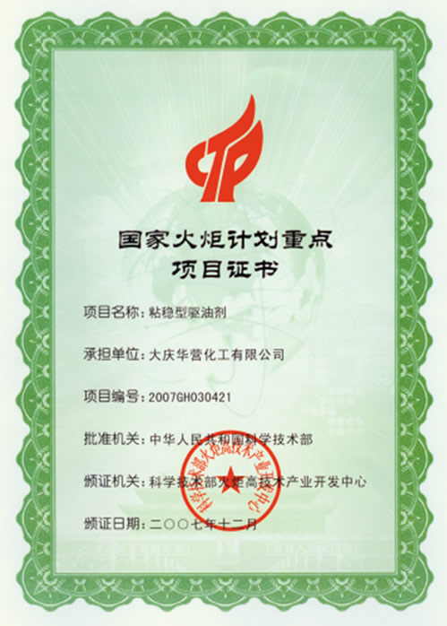 國家火炬計劃重點(diǎn)項目證書(shū)_榮譽(yù)資質(zhì)_大慶華營(yíng)化工有限公司