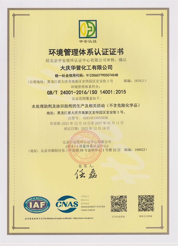 環(huán)境管理體系認證證書(shū)_榮譽(yù)資質(zhì)_大慶華營(yíng)化工有限公司